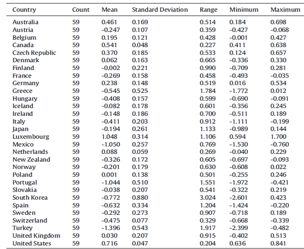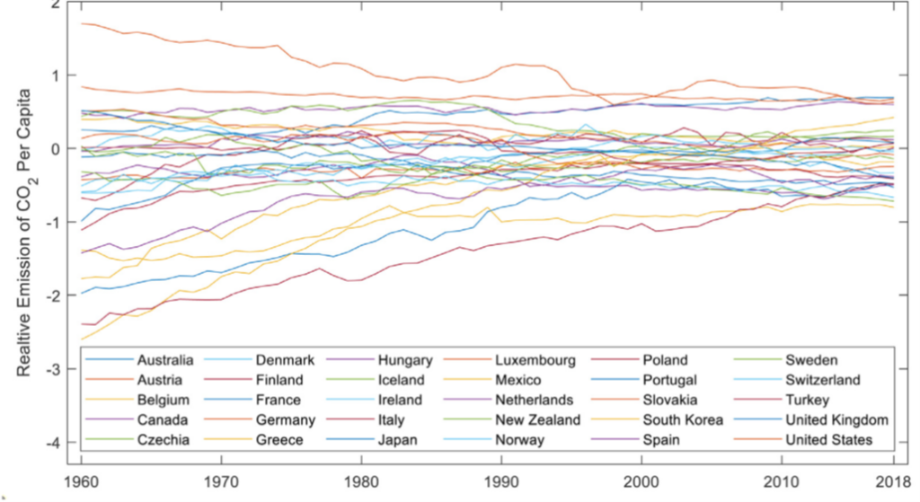 Table 1 gives descriptive statistics of these relative variables. Of the 30 countries examined, 19 have per capita carbon emissions less than the average, while the remaining 11 have per capita emissions bigger than the average. Luxembourg has the highest elative mean by a large margin, followed by the United States, while Turkey has the lowest value. South Korea has the highest standard deviation of relative emissions, and the United States has the lowest value.