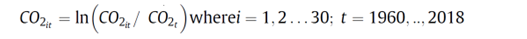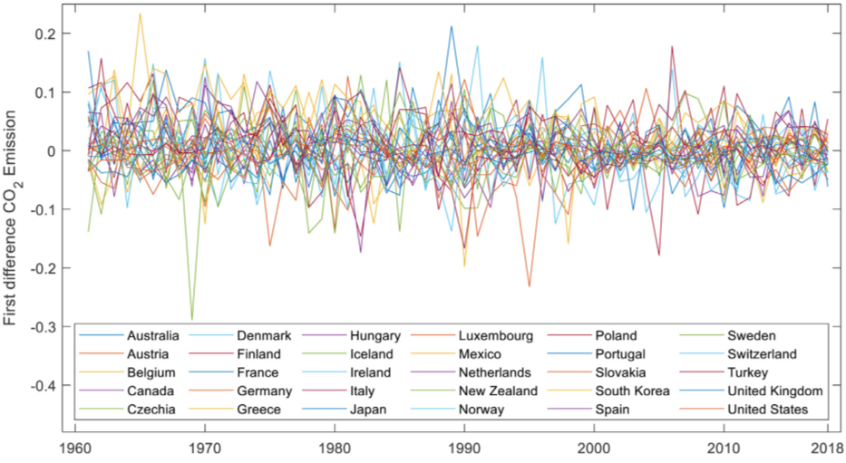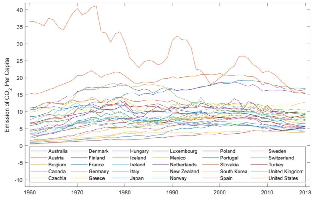 The study takes the CO2 per capita data by country from the GitHub repository, which presents gross carbon emission data from the Global Carbon Project of the Future Earth, they select data from 1960 to 2018 for 30 OECD countries: the initial 24 OECD countries (Australia, Austria, Belgium, Canada, Denmark, Finland, France, Germany, Greece, Iceland, Ireland, Italy, Japan, Luxembourg, the Netherlands, New Zealand, Norway, Portugal, Spain, Sweden, Switzerland, Turkey, the United Kingdom, and the United States) and the six countries that joined OECD between 1994 and 2000 (Czech Republic, Hungary, Mexico, Poland, Slovak Republic, and South Korea). New eight member countries after 2000 are excluded. As required for stochastic convergence analysis, they use relative emissions, that is, the log of the ratio between each country’s annual per-capita emissions and the corresponding OECD average given as below: