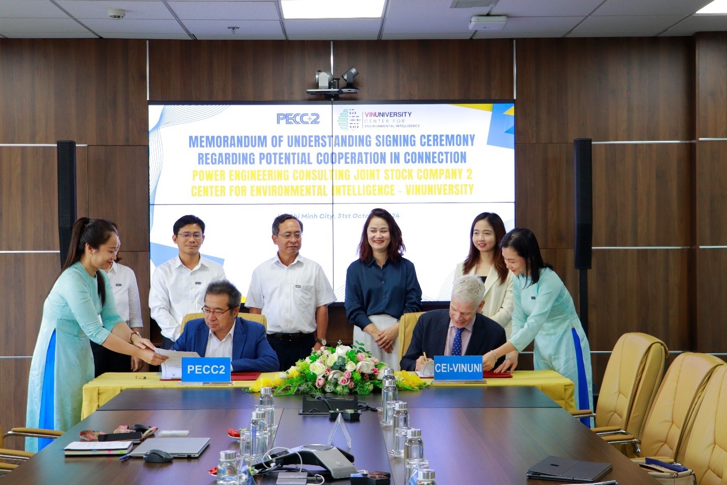 On October 31, 2024, VinUni’s Environmental Intelligence Center (CEI) and PECC2 took a pivotal step in promoting environmental innovation by signing a Memorandum of Understanding (MOU). This collaboration aims to strengthen both educational and technical development within the realms of renewable energy, sustainable technologies, and artificial intelligence applications in energy management.